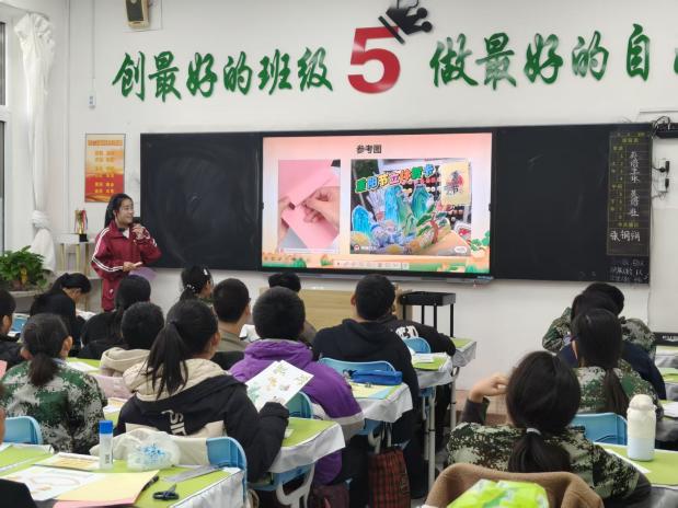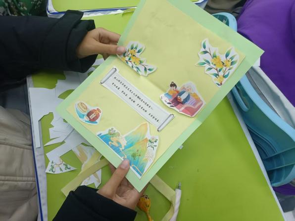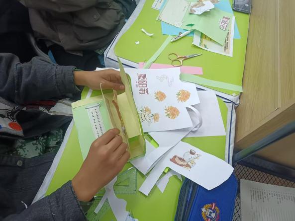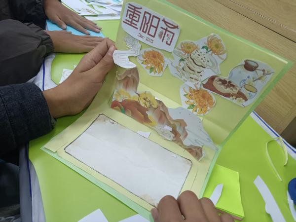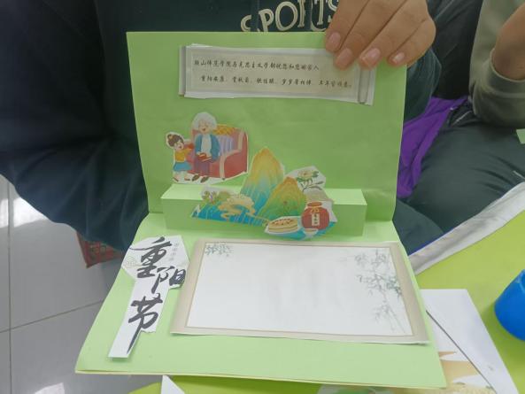 课程精心设计了三个环节,兼具文化性、趣味性与教育性,实现了寓教于乐。课堂伊始,唐卓同学通过历史故事和生动的讲解,为同学们揭开了重阳节千年传承的文化面纱,详细介绍了登高、赏菊、佩茱萸等传统习俗背后的文化意蕴。随后进入故事分享环节,同学们踊跃讲述自己与长辈相处的温馨点滴,并在“孝心清单”互动中反思自身行为。当谈及具体可行的孝亲行动时,现场气氛热烈,同学们纷纷举手响应。唐卓同学适时引导,启发大家从日常小事做起,践行孝道,懂得感恩与回报。最后,同学们动手制作感恩贺卡,将对长辈的真挚祝福倾注于笔端。一张张精美的贺卡不仅承载着浓浓的情意,更成为连接代际情感的文化纽带。