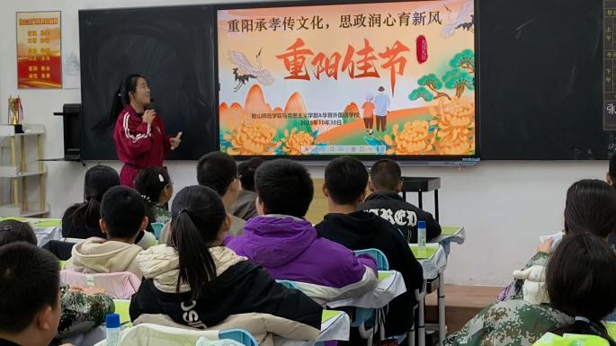 为深入推进大中小学思政课一体化建设,传承和弘扬中华优秀传统文化,10月30日,鞍山师范学院马克思主义学部走进华育外国语中学,为初中生们带来了一场别开生面的“重阳承孝传文化,思政润心育新风”主题思政课。