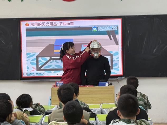 课堂伊始,主讲人邓冉同学通过趣味动画片还原不同的火灾现场,直观展示了火灾对生命财产及环境的严重威胁。随后邓冉同学以答题的形式展示多种错误用火的行为,结合案例细致讲解,重点演示逃生面罩佩戴步骤并手把手指导,确保学生熟练掌握消防逃生技能。